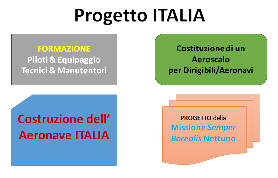 Il Progetto ITALIA consiste nell'ideare, nell'organizzare, e nel realizzare una nuova e più moderna Aeronave ITALIA (Aeronave ITALIA 2), avente una livrea simile a quella celebre e storica del 1928, con una struttura certificata ENAC (EASA) in ottemperanza alla Circolare ENAC NAV 15F, e nel compiere, con un sodalizio no-profit, una missione commemorativa e celebrativa, dapprima evocativa, per il necessario volo di trasferimento sino alle latitudini del Circolo Polare Artico, e successivamente più avventurosa e dal carattere più scientifico ed esplorativo nell'area Artica, raggiungendo inizialmente le Isole Shetland e Faroe, l'Islanda, e la Groenlandia, spingendosi sino nel suo Nord-Est, per un'esplorazione all'estremo occidentale della Valle di Wandel e della Calotta glaciale Hans Tausen sino al Picco do Odino ed al Fiordo di Odino, da cui dirigersi in seguito nell'ampio Oceano Artico da Capo Morris Jesup/Capo Bridgman, raggiungendo e sbarcando poi al Polo Nord geografico. sorvolando in seguito il Polo Nord Magnetico e quello dell'inaccessibilità. Durante il rientro, la missione sarà infine rivolta anche alla ricerca dei perduti resti metallici del Dirigibile N4 ITALIA attualmente ancora sul fondo oceanico in una posizione geografica presunta ma non esattamente nota (Punto Italia). Al raggiungimento della Baia del Re, presso NyAlesund allo Spitzbergen (Svalbard), che conserva ancora oggi lo storico pilone d'attracco delle aeronavi italiane, alto circa 35 m, si costituiranno e concluderanno le formali cerimonie pubbliche e le varie commemorazioni di quei memorabili eventi che videro gli italiani per primi raggiungere, per ben due volte, il vertice polare Nord del mondo un secolo fa, e che infine conclusero l'incredibile e felice epoca eroica delle più grandi e storiche esplorazioni geografiche terrestri.