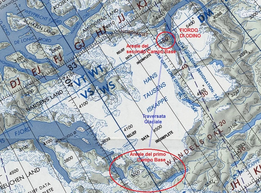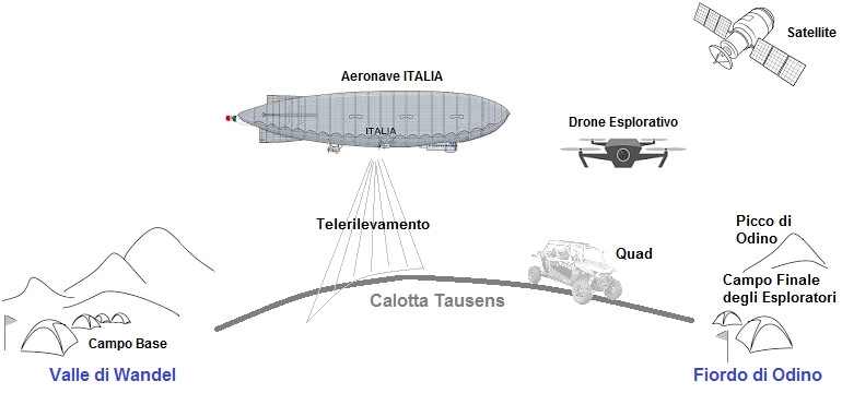 Qualora risulti possibile, la spedizione della squadra degli esploratori, muniti nel caso di uno speciale veicolo Quad a 4 posti, lascerà il Campo Base, ed attraverserà la Calotta Tausen (Dislivello circa 500 m) sino a raggiungere il Fiordo di Odino a Nord, ove stabiliranno un secondo campo base, percorrendo una distanza valutata intorno ai 75 km assistiti continuamente dall'Aeronave ITALIA in sorvolo attivo per i molteplici telerilevamenti multispettrali, cartografici, e per le misurazioni dei parametri fisici e magnetici, ed in particolare lo spessore del ghiaccio.